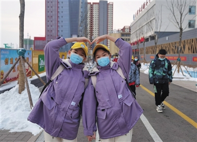 2月17日,我市各中小学校错时错峰有序开学,师生们精神饱满地迎来新学期。 据了解,教育部门在开学前,对疫情防控、校园安全等进行验收检查。各学校做好人员排查、分类健康管理、防控物资储备、校园环境卫生等工作,把好校园安全第一道关口,为孩子们健康成长保驾护航。图为在市实验小学东校区,两名学生摆出心形图案,迎接新学期的到来。 本报记者 戎禹仁 摄