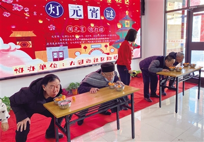 ▼ 15日,平城区水泊寺街道恒大社区联合恒大绿洲物业开展了猜灯谜活动,五颜六色的彩旗和谜面在空中飘起,不时有居民扯下谜面前往兑奖区核对谜底。此外,社区还准备了抢板凳、做灯笼等活动,居民和工作人员都参与其中,欢声笑语不断。