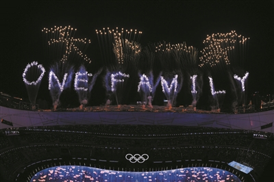 盛大焰火腾空而起,在体育场上空呈现出五环形状、“天下一家”中英文字样,歌声、掌声、欢呼声响彻云霄,国家体育场成了欢乐的海洋。