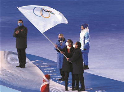 奥林匹克会旗交接仪式开始。北京市市长陈吉宁挥动五环旗,然后交给国际奥委会主席巴赫。巴赫将会旗交给下届冬奥会主办城市意大利米兰市市长萨拉和科尔蒂纳丹佩佐市市长盖迪纳。