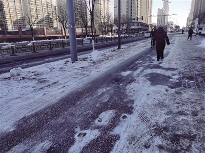 记者昨日在现场看到,部分路段人行道上结着坚硬的冰面,行人走上去一小步一小步地向前挪,一不小心就会打“出溜”。有位老人路过此处时,一个踉跄险些滑倒,只能从机动车道上绕行,从此通过的机动车纷纷避让。