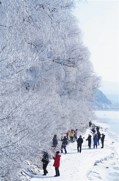 ▲2月22日,游客在吉林市松花江边欣赏雾凇美景。