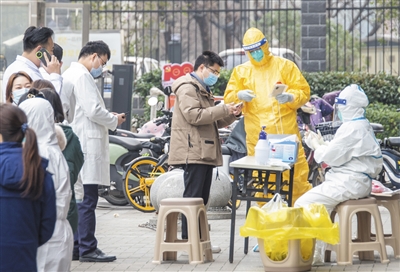 2月22日,市民在武汉市圆梦家园社区核酸检测点进行核酸检测。