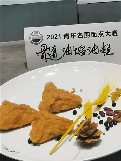 记者在采访中了解到,2021青年名厨面点大赛要求参赛选手在规定时间内完成5个提褶包子,每个包子要有18个以上的褶。郝雄制作的包子不仅褶细,而且达到了25个。除了提褶包子外,郝雄还制作了髓油糕和老北京糖油饼。郝雄说,老北京糖油饼是老北京的经典小吃,色泽红润,吃到嘴里甜咸碰撞,酥脆掉渣,越嚼越香。髓油糕则是“得月楼”具有代表性的特色面食,他之所以选择在比赛中做髓油糕,是希望能让更多的人知道“得月楼”的髓油糕。他说,制作髓油糕时,不仅糕面选用的是大同本地上好的糕面,色泽金黄、口感筋道,而且馅料也是精选老黄牛棒骨里的骨髓,经去渣后,又添加了黑芝麻、白芝麻、红糖、白糖、果脯、桃仁、花生仁等制作而成,味道香甜,令人回味无穷。最终,他做的髓油糕和老北京糖油饼赢得了评委们的一致好评,并荣获金奖。