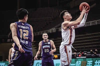 3月1日,在辽宁沈阳进行的2021-2022赛季中国男子篮球职业联赛(CBA)第三阶段第29轮比赛中,上海久事队以134∶110战胜南京同曦宙光队。图为上海久事队球员李添荣(右)在比赛中上篮。