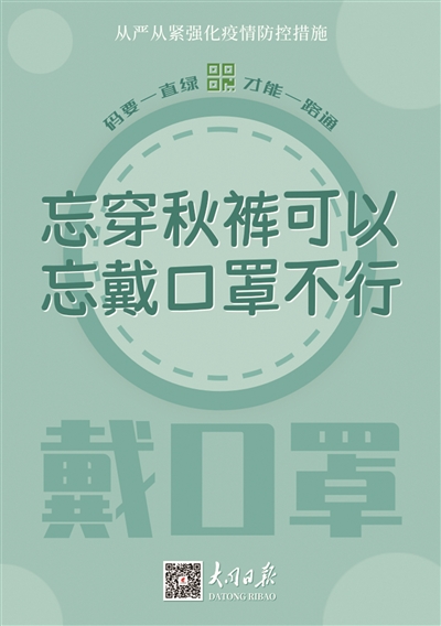 当前,国内疫情仍呈多点散发态势,大同市疫情外防输入压力巨大。为有效控制和降低疫情传播风险,我们再次提醒大家,一定要从严从紧强化疫情防控措施,为了正常工作和生活,码要一直绿着才好。