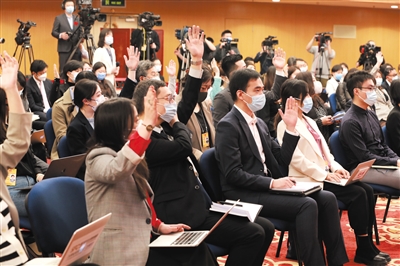 这是记者在位于梅地亚中心的分会场举手提问。 新华社发