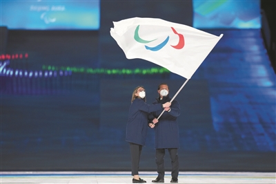 现场唱响意大利国歌,升起意大利国旗。大屏幕上播放下届冬残奥会主办城市短片《我们是光》。