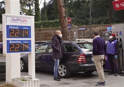 ▶ 3月12日,人们在意大利罗马一处加油站为车辆加油。