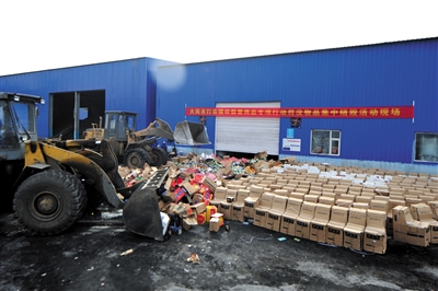 随着大型机械的轰鸣声,现场堆放的白酒、方便面、药品等假冒伪劣商品被碾压,经粉碎后送入焚烧炉,以无害化处理的方式销毁。