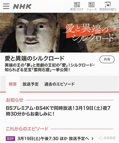 本报讯 (记者 崔莉英) 日文版纪录片《云冈石窟——爱和别样的丝绸之路》(中文译名)HD版和4K版于东京时间2022年3月19日晚7:30分在日本国家电视台NHK高清频道和BS4K频道同步播出,该片8K版于东京时间20日晚6时在NHK BS8K频道播出。