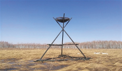 图为木制三脚架人工招引巢。