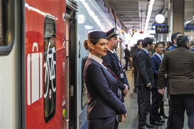 3月19日,在塞尔维亚首都贝尔格莱德,乘务员在等待乘客上车。
