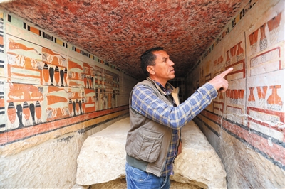 3月19日,在埃及首都开罗以南的塞加拉地区,考古工作者在一处古墓内介绍壁画。