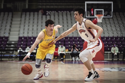 在辽宁沈阳进行的2021-2022赛季中国男子篮球职业联赛(CBA)第三阶段第37轮比赛中,浙江广厦控股队以122∶80战胜上海久事队。图为浙江广厦控股队球员孙铭徽(左)带球突破。