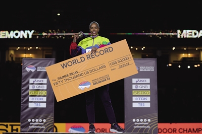 3月20日,在塞尔维亚贝尔格莱德举行的2022年室内田径世锦赛女子三级跳远比赛中,委内瑞拉选手罗哈斯以15.74米的成绩夺冠,并创造新的世界纪录。图为罗哈斯在颁奖仪式上。