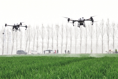 3月30日,在济源市五龙口镇西逯寨村,农技人员操作植保无人机在麦田作业。