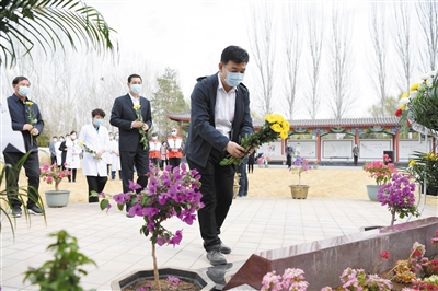 ◀ 3月30日,参加活动的嘉宾在向纪念碑献花。