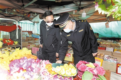 “清明时节祭奠亲人,可以选择在网上祭奠,也可以用鲜花代替纸钱。”“用鲜花祭祀更环保、更安全!”“这是文明祭祀倡议书,您看一看。”……执法人员对街头烧纸的市民进行耐心劝导,疏导群众文明祭祀。
