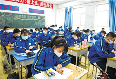 4月1日,呼和浩特市铁路第二中学高三年级学生在教室里上课。