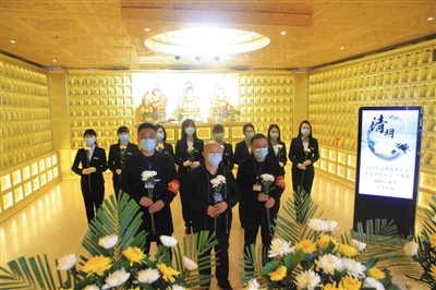 市殡葬服务中心在馆内的三座骨灰堂前分别举行了简约庄重的代祭仪式。每个骨灰堂前都设立了代祭台,台上摆有花篮、电子烛灯、“心”形烛火,还有菊花。上午10时30分许,代祭仪式首先在“千佛堂”骨灰堂举行,代祭人员着正装,神情肃穆。殡葬礼仪师宣读祭词,代祭人员行鞠躬礼并手持菊花进入骨灰堂缅怀、献花,传递逝者家属对亲人的思念。“通过代祭仪式,满足群众特殊时期的祭扫需求,弥补群众不能到现场祭扫的遗憾。”市殡葬服务中心负责人马建军说。