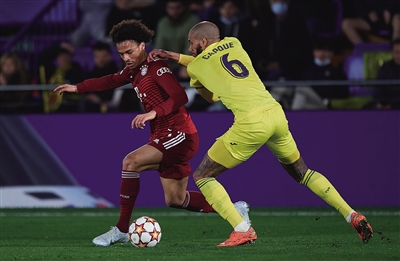 4月6日,在2021-2022赛季欧洲足球冠军联赛四分之一决赛首回合比赛中,西甲比利亚雷亚尔队主场1∶0胜德甲拜仁慕尼黑队。图为拜仁慕尼黑队球员格纳布里(左)与比利亚雷亚尔队球员卡普拼抢。
