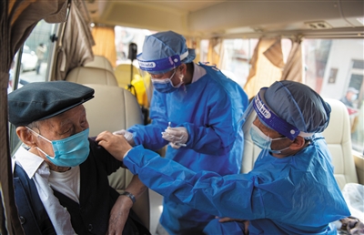 当日,一辆流动疫苗接种车开进了北京市朝阳区呼家楼街道的向军北里小区,为小区及周边的老年人提供新冠疫苗就近接种服务。