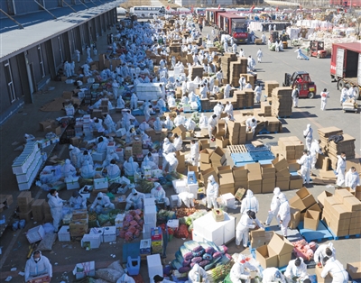 ▶在中国供销农产品(沈阳)集配中心,沈抚新区机关干部和社区志愿者在分拣蔬菜(4月6日摄,无人机照片)。