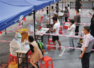 ◀4月9日,在广州市荔湾区白鹤洞街道广钢新城,居民排队进行核酸采样。