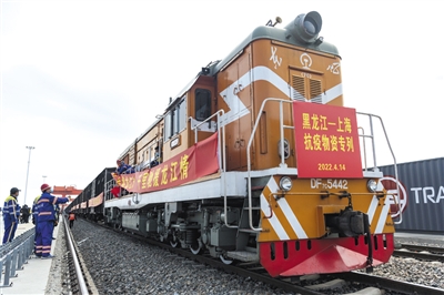 当日,一列装载着600万斤优质大米的货运列车从哈尔滨国际集装箱中心站启程开往上海。这列黑龙江省支援上海市抗疫物资专列预计于4月16日抵达上海市何家湾站,助力上海打赢疫情防控阻击战。