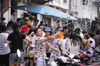 ▶ 4月16日,人们在老挝琅勃拉邦古城参加泼水节庆祝活动。
