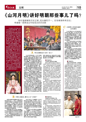 这部剧以明朝第三位皇帝朱棣为主角,讲述他从青涩的燕王逐渐成长为杰出的政治军事家,最终开创永乐盛世的故事。不过,观众抱着看正剧的期待点开《山河月明》,却发现历史剧常见的君臣博弈、边疆战事、王位之争等元素虽然没被落下,但这部剧的基调却非常“接地气”。尤其是在头10集里,严肃沉重的帝王故事被拍成了“老朱一家人”,观众对此褒贬不一。总导演高希希在接受采访时表示,“在《新三国》《楚汉传奇》以后,我希望制作一部更加适合现代年轻观众去观赏和思考的剧”。