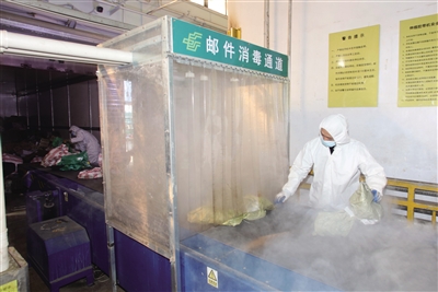 本报讯 (记者 张彩峰) 为严防疫情通过寄递渠道传播扩散,市邮政分公司采取多环节消毒措施,对所有快件包裹进行“六面消杀”,全力保护邮政行业从业人员和人民群众身体健康。