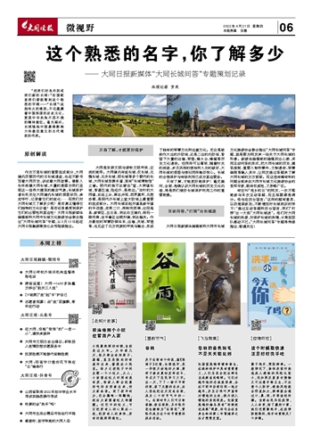 大同日报新媒体编辑部和大同市长城文化旅游协会联合推出“大同长城问答”专题,就是要为网友来一场关于大同长城的科普。新媒体编辑部的编辑别出心裁,采用互动问答的形式,把大同长城的历史、建筑规制、重要人物和事件、文物遗存、军事编制等融入其中,让网友通过答题来了解大同长城的方方面面。而这些有趣有料的问题全部来自大同市长城文化旅游协会的资深专家,既有权威性,又涉略广泛。