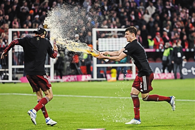 终场哨声响起,大屏幕上3∶1的比分变成了早已设计好的十连冠海报。穿着巴伐利亚传统裙装的姑娘们将一扎又一扎啤酒送进绿茵场,安联球场开启“泼酒节”狂欢。