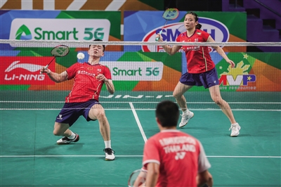 26日,在菲律宾马尼拉举行的2022年亚洲羽毛球锦标赛混双首轮比赛中,中国组合郑思维/黄雅琼以2∶0战胜泰国组合玛卡萨西通/哲尼差,晋级下一轮。图为郑思维(上左)/黄雅琼在比赛中。