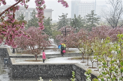 27日,我市大部分地区出现降雪天气,西城墙带状公园海棠花披上了一层薄薄的白雪,呈现出一派银装素裹的美丽景象,吸引众多市民冒雪赏花。
