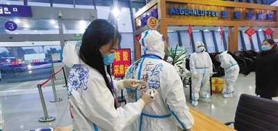 生动有趣的防疫服漫画吸引了不少过往旅客的目光,还有不少人现场拍照发在网上点赞。