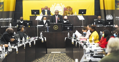 4月26日,在南非立法首都开普敦,南非总统拉马福萨(中)在议会两院关于洪灾的全体会议上讲话。