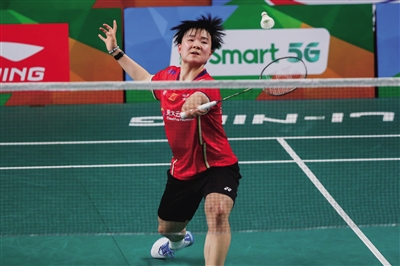 27日,在菲律宾马尼拉举行的2022年亚洲羽毛球锦标赛女单首轮比赛中,中国选手何冰娇以2∶1战胜日本选手大堀彩,晋级下一轮。图为何冰娇回球。