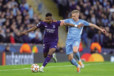 4月26日,在2021-2022赛季欧洲足球冠军联赛半决赛首回合比赛中,英超曼彻斯特城队主场以4∶3战胜西甲皇家马德里队。图为皇家马德里队球员罗德里戈(左)与曼彻斯特城队球员津琴科拼抢。