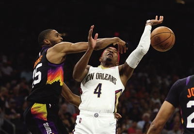 4月26日,在2021-2022赛季NBA季后赛西部首轮第五场比赛中,菲尼克斯太阳队主场以112∶97战胜新奥尔良鹈鹕队,目前以总比分3∶2暂时领先。图为太阳队球员布里奇斯(左)在比赛中防守鹈鹕队球员格拉汉姆。