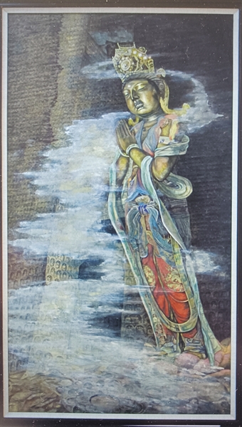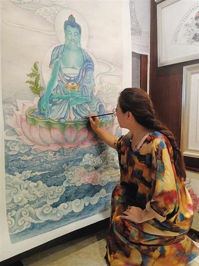 “传统技巧一般是简单的勾线、着色、沥粉贴金,但每一个朝代也有区别,有的以线为主,讲究明暗交错,有的以色为主,注重色彩取胜,现在则是色线的交融与结合。”在对传统壁画技法有了全面了解后,刘遇春从家族传承和敦煌壁画中汲取营养,结合大同元素和对自然万物的理解,不断挖掘、实践与创新。在她的画笔下,云冈大佛是那么厚重古朴,合掌露齿菩萨是那么形象生动,临摹的永安寺壁画是那么惟妙惟肖……