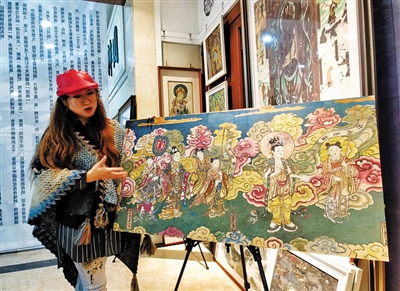 “岩彩壁画是指以矿物颜料为主要用色的艺术作品,属于中国传统绘画艺术,它可以独立使用,也可以与油画、水彩、水粉等结合,还可以与金、银、铜等各种物质颜料相结合;可以是平面的展现,也可以是立体的呈现。因此,它的语言可以说是极其丰富、无限扩展的,咱们大同的岩彩壁画以云冈石窟、华严寺、永安寺等为代表。这门艺术发展到今天,亟需我们去保护、研究和利用。”日前,记者走进御河文苑,大同市女画家协会主席刘遇春介绍什么是岩彩壁画。