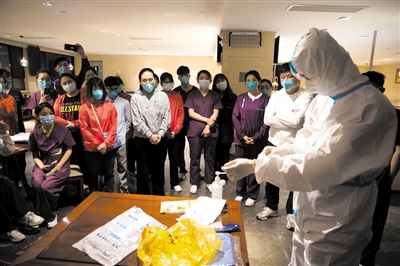 4月28日,在上海浦东北蔡镇一家酒店,东方医院南院医护人员和下午抵达的杭州口腔医院援沪医疗队队员交流核酸采样注意事项。