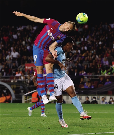 5月10日,在2021-2022赛季西班牙足球甲级联赛第36轮比赛中,巴塞罗那队主场以3∶1战胜塞尔塔队。图为巴塞罗那队球员德容(上)与塞尔塔队球员塔皮亚在比赛中争顶。