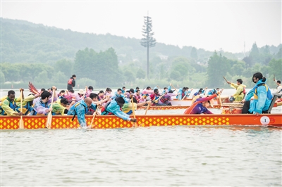 当日,华中科技大学第三届中外学生龙舟友谊赛在武汉市喻家湖举行。来自19个学院的近一百名中外学生,组成六支以中国生肖命名的队伍,在150米直道竞速的比赛中一决高下。
