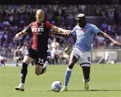 5月15日,在2021-2022赛季意大利足球甲级联赛第37轮比赛中,那不勒斯队主场以3∶0战胜热那亚队。图为那不勒斯队球员奥斯梅恩(右)与热那亚队球员奥斯蒂高在比赛中拼抢。