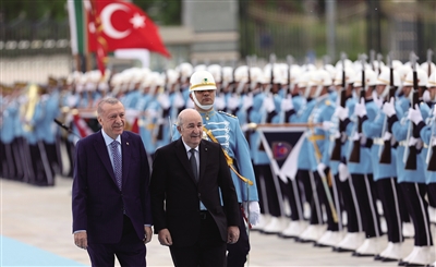 ▶ 5月16日,在土耳其安卡拉,土耳其总统埃尔多安(左)欢迎到访的阿尔及利亚总统特本。