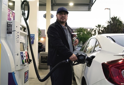 5月16日,一名男子在美国加利福尼亚州米尔布雷的一家加油站给汽车加油。